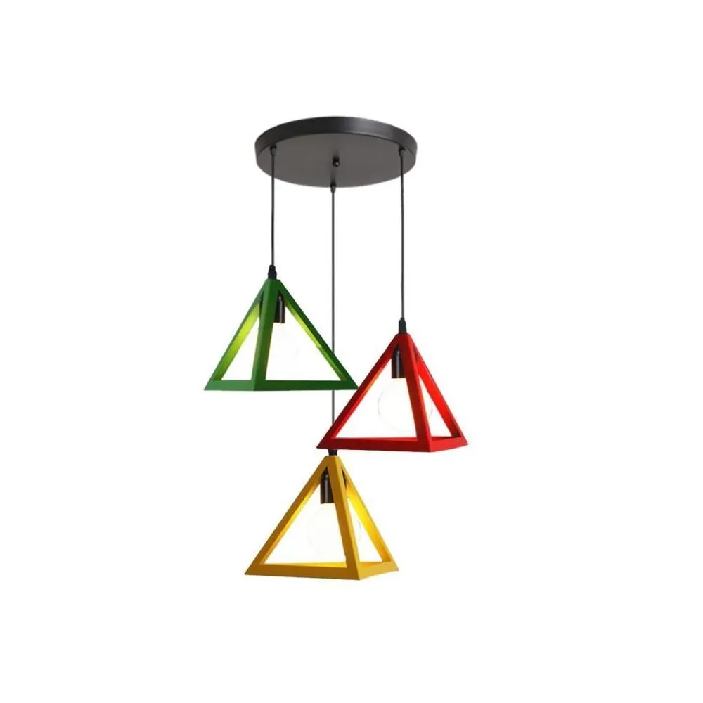 Κρεμαστό φωτιστικό με κόκκινο, κίτρινο και πράσινο χρώμα τρίγωνο (00400320). Το φωτιστικό αυτό είναι ιδανικό για τοποθέτηση σε σαλόνι ή δωμάτιο σπιτιού, σε μπαρ κτλ. Έχει ωραίο design και το χρώμα των πυραμίδων είναι σε κόκκινο, κίτρινο και πράσινο