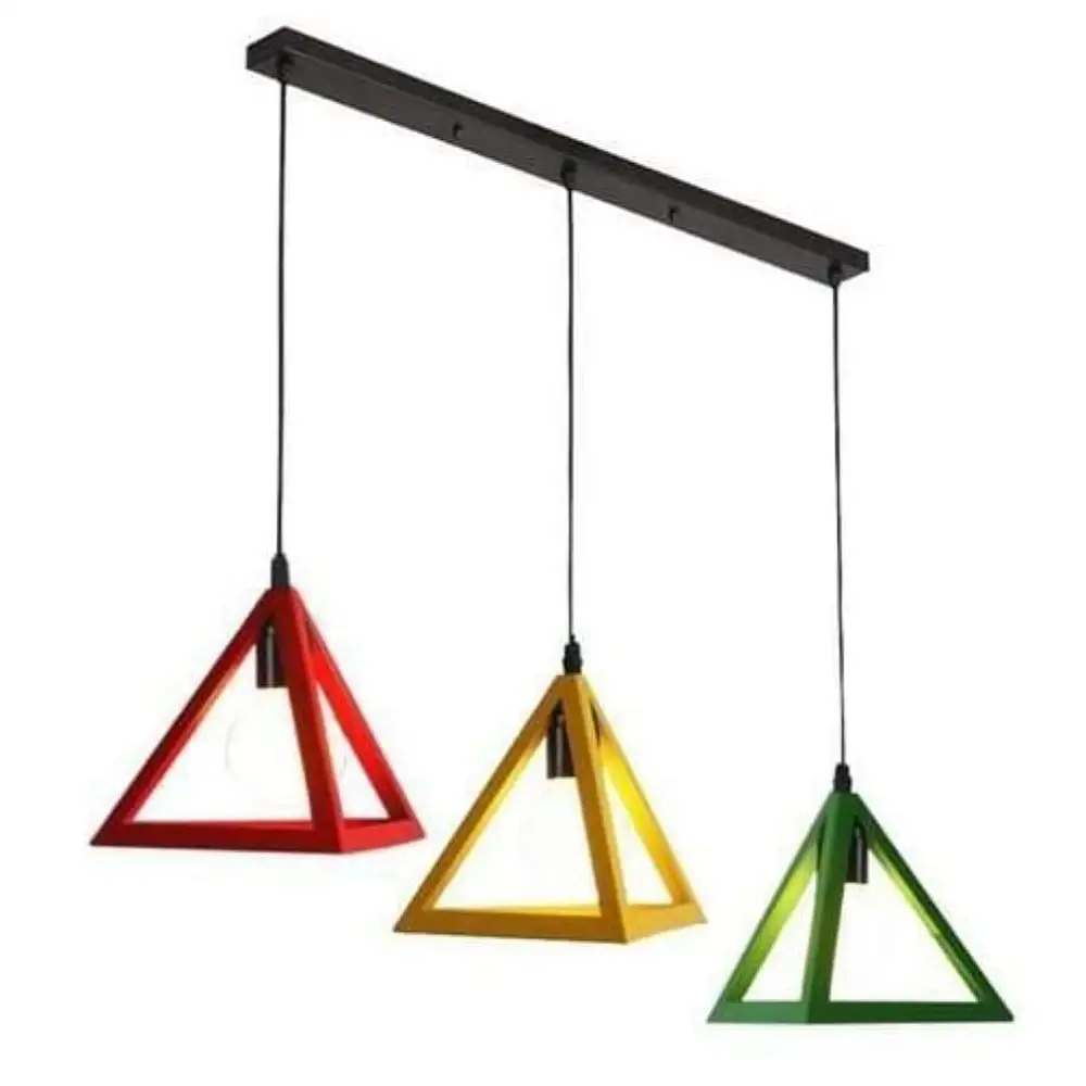 Κρεμαστό φωτιστικό με κόκκινο, κίτρινο και πράσινο χρώμα τρίγωνο (00400620). Το φωτιστικό αυτό είναι ιδανικό για τοποθέτηση σε σαλόνι ή δωμάτιο σπιτιού, σε μπαρ κτλ. Έχει ωραίο design και το χρώμα των πυραμίδων είναι σε κόκκινο, κίτρινο και πράσινο