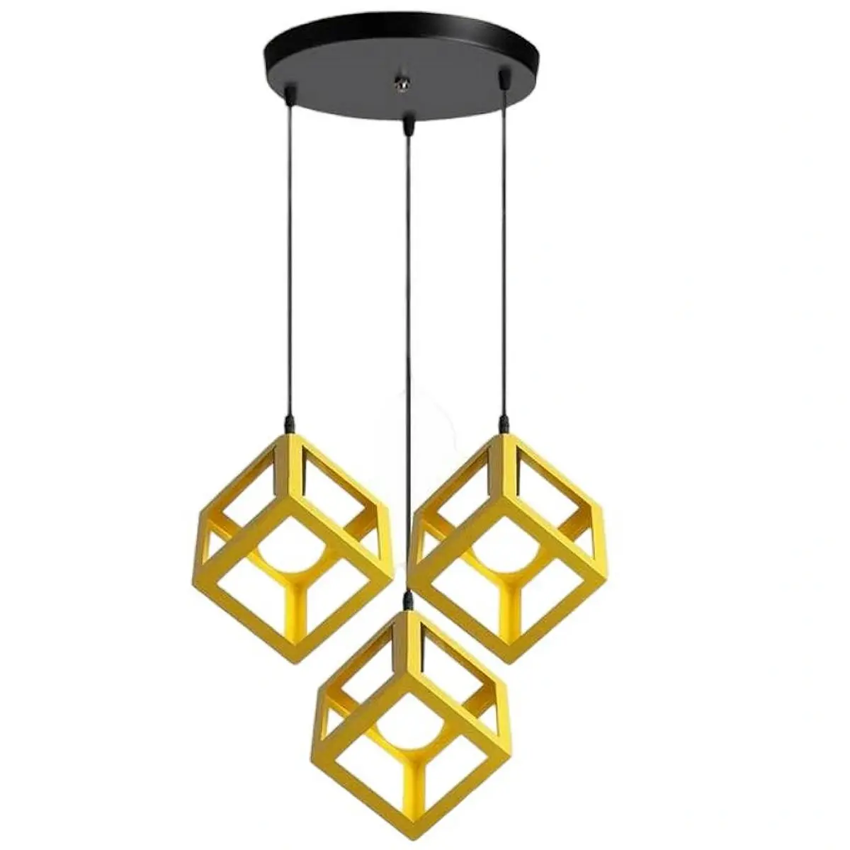 Φωτιστικό κρεμαστό τρίφωτο τετράγωνο κύβος μεταλλικό σε κίτρινο χρώμα με μαύρη ροζέτα (00500340). Έχει ένα ιδιαίτερο φωτιστικό σε vintage σχεδιασμό που θα εντυπωσιάσει και είναι ιδανικό για να διακοσμήσετε το χώρο σας και να δώσετε μια διαφορετική άποψη. Μπορεί να χρησιμοποιηθεί σε σαλόνι, κουζίνα, δωμάτιο, καφέ, μπαρ, εστιατόρια